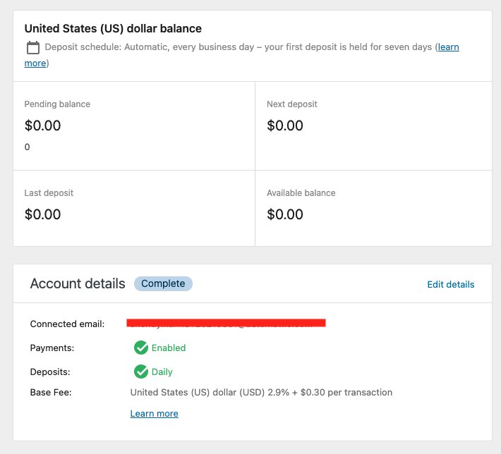 When there is already a Stripe account connected (after KYC), going to wp-admin > Payments will bring up the new account overview page. Here is how it looks like: