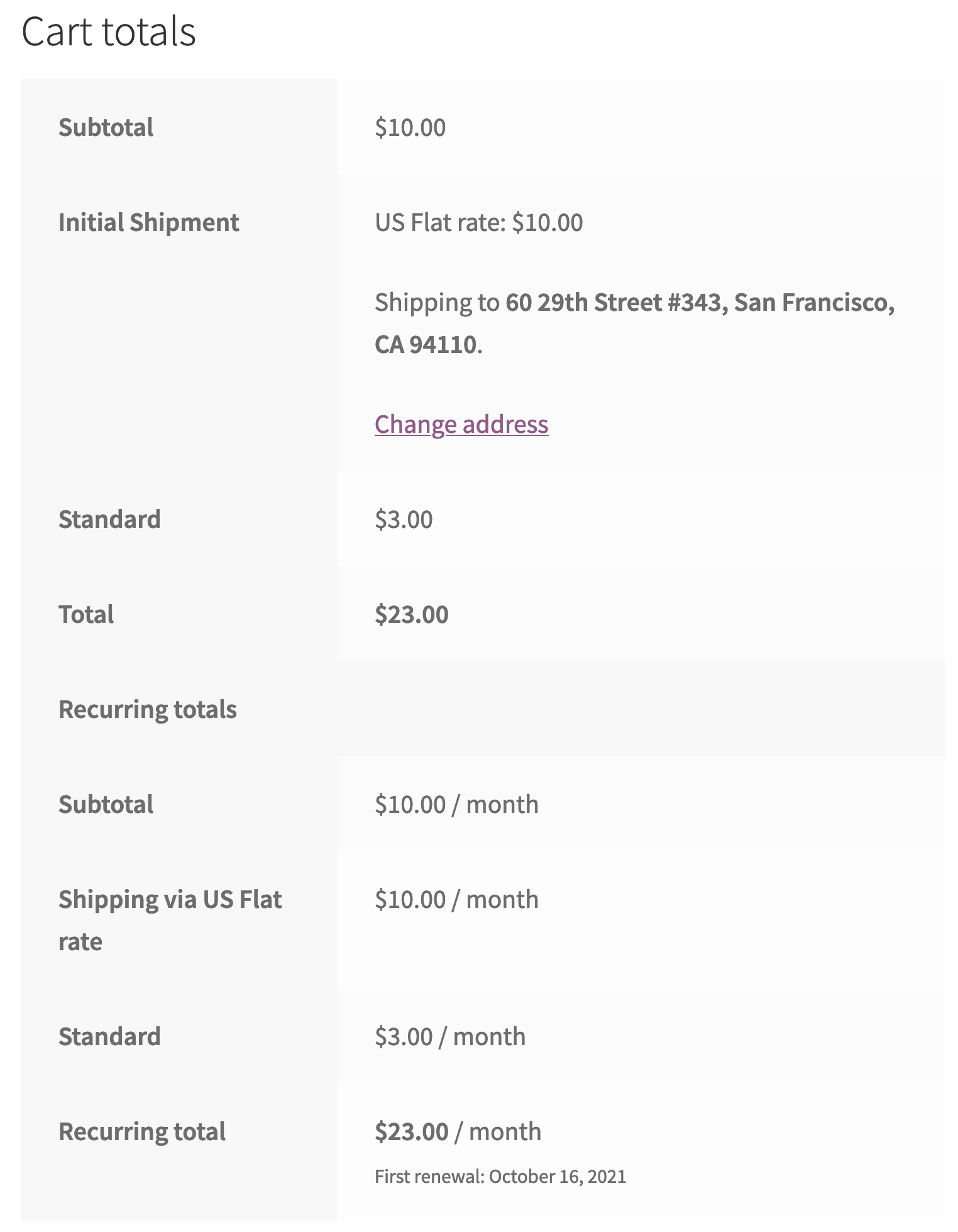 Ensure the cart totals are correct and include the one-time shipping fee.
