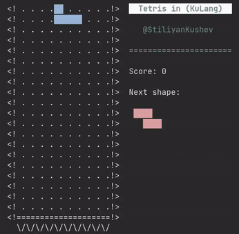 # Compile and run hello world (automatically runs after compilation) ./kulang-macos.sh examples/helloworld.ku -c -o hello # View AST or assembly ./kulang-macos.sh examples/helloworld.ku -a ./kulang-macos.sh examples/helloworld.ku -c -o hello -m # Run games (automatically compiles and runs with interactive terminal) ./kulang-macos.sh examples/snake.ku -c -o snake ./kulang-macos.sh examples/tetris.ku -c -o tetris # Run tests ./test-macos.sh -c
